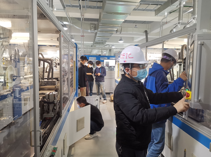 方案確定,馬上實施,毫不耽擱。團隊與時間賽跑,直至攻破技術(shù)難關(guān),成功完成首臺串焊機二次配接線工作,雖然時間已是凌晨,但是每個人的臉上都寫著“值得”兩個字!一個可能導(dǎo)致項目嚴重滯后的問題在24小時內(nèi)妥善解決,無不彰顯電科人走好科技自立自強之路的拼搏精神!