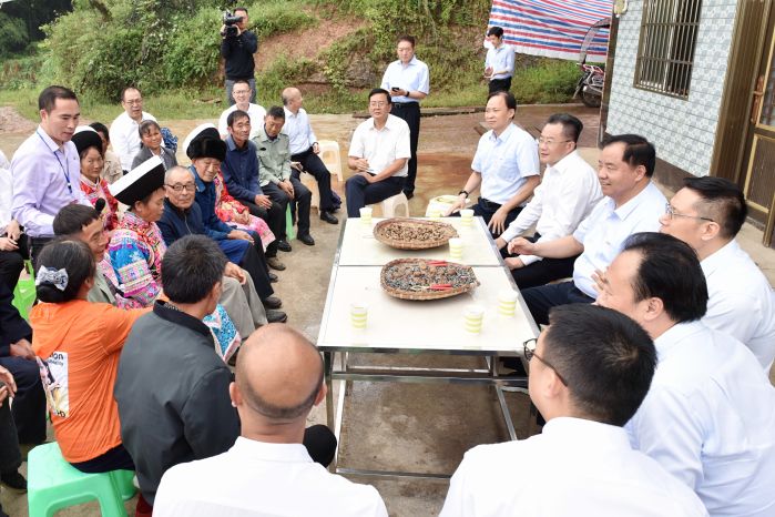 在白臘苗族鄉(xiāng)高峰村,陳肇雄一行實地查看了“支部共建、結(jié)對幫扶”機制落實情況,聽取了村委會發(fā)揮“黨建扶貧綜合陣地”作用,為黨員活動、技術(shù)培訓、農(nóng)產(chǎn)品上網(wǎng)、鄉(xiāng)村醫(yī)療等提供“硬件”條件,幫助提升黨建、民生服務和智慧農(nóng)牧業(yè)的情況介紹,鼓勵大家要用好信息技術(shù)手段提高本領(lǐng)。